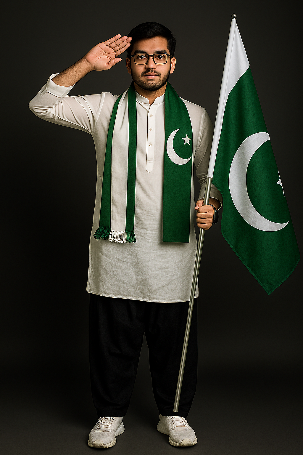 Add soft shadows, and make the background subtly feature the crescent and star of the Pakistani flag. The expression should be calm and determined—perfect for Independence Day celebrations.